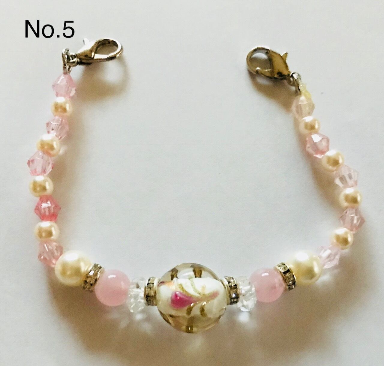 天然石のディープローズクォーツや水晶、淡水パールに、センターはトンボ玉を使用しています。